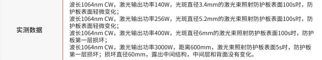 波长1064nm CW,激光输出功率3000W,距离600mm,激光束照射防护板表面5s时,防护板第一层损坏;损坏直径60mm,露出中间结构,中间层和背面没有变化。