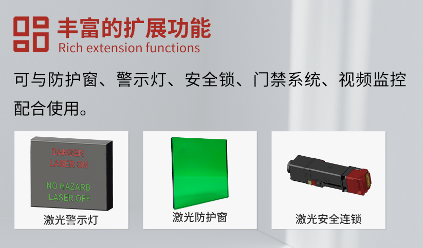 It can be integrated with laser safety windows, warning lights, access control systems,